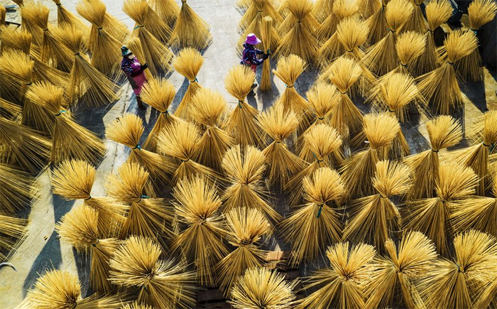 12月2日,江西省抚州市资溪县高阜镇石陂村,农妇在镇泰伯竹制品加工厂晾晒竹篾。近年来,拥有“中国特色竹乡”美誉的资溪县,依托55万亩丰富的毛竹资源优势,大力推进竹产业集群发展和毛竹精深加工,全县涌现出一批在家门口靠发展毛竹产业创业致富的巾帼带头人。(吴志贵)