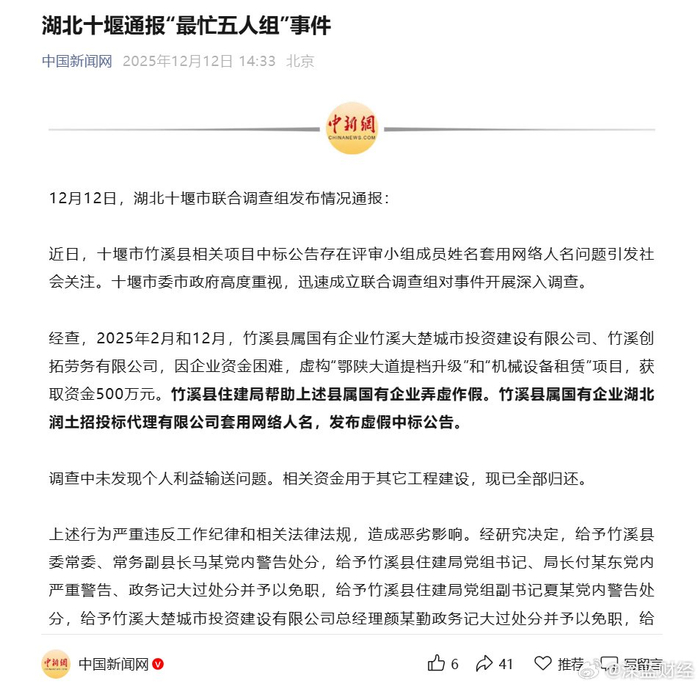 经查,2025年2月和12月,竹溪县属国有企业竹溪大楚城市投资建设有限公司、竹溪创拓劳务有限公司,因企业资金困难,虚构“鄂陕大道提档升级”和“机械设备租赁”项目,获取资金500万元。竹溪县住建局帮助上述县属国有企业弄虚作假。竹溪县属国有企业湖北润土招投标代理有限公司套用网络人名,发布虚假中标公告。