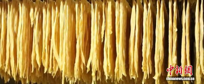 工人们凭借经验轻轻挑起豆膜,逐片挂在晾晒架上,反复挑皮塑形,再送至盐卤区调味定型,使腐竹口感紧实醇厚。最后,将成型的腐竹移至通风处烘晒,待水分蒸发至适宜程度,色泽金黄、质地柔韧的腐竹便制作完成。整个过程坚守手工匠心,保留地道风味。