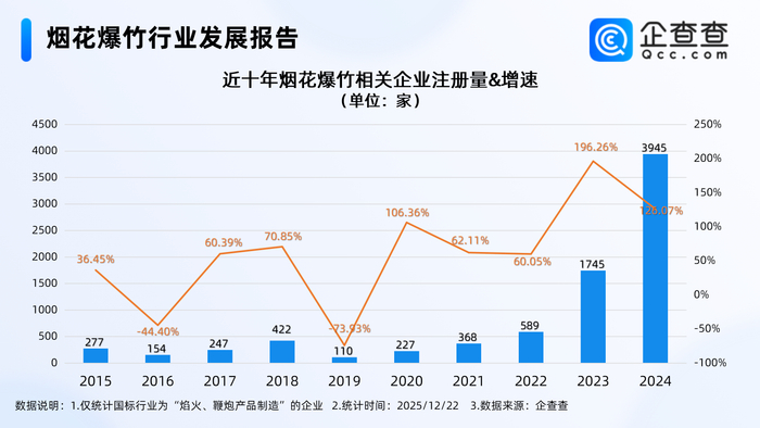 企查查数据显示,截至12月22日,国内现存烟花爆竹相关企业7141家。近十年相关企业注册量呈整体增长态势,其中2023年、2024年烟花爆竹相关企业注册量分别同比快速增长196.26%、126.07%至1745家、3945家。截至目前,今年已注册2365家烟花爆竹相关企业。