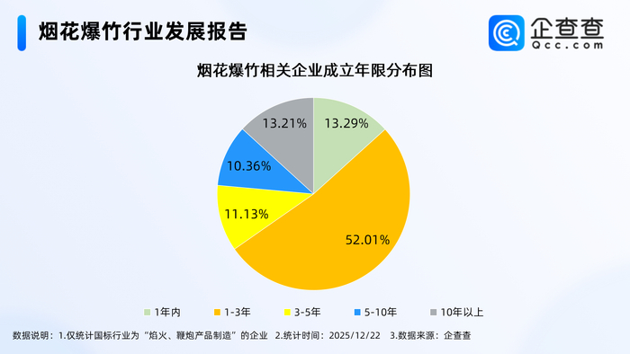企查查数据显示,从经营时间来看,成立年限在1-3年的烟花爆竹相关企业占比过半,达52.01%。其次,成立年限在1年内、10年以上的相关企业分别占比13.29%、13.21%。